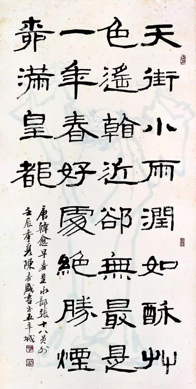 自受业李伟、李家培以来,受恩师耳提面命,陈春盛的隶书也是沿袭吴子复先生教学提倡的“六碑”习书之法——《礼器碑》《张迁碑》《西狭颂》《石门颂》《郙阁颂》《校官碑》而层层递进,同时上下求索,上追秦砖汉瓦、竹简帛书,下涉清人隶书及当代名家,汲取伊秉绶、章炳文、周俊杰诸家长处,润自家笔墨。陈春盛喜以长锋运毫,水墨交融,浓淡相兼,放笔果敢而稳健,无一刻迟滞,纯熟之中不落陈套,通篇下来,往往自出机轴,字法多变而谐和自然。